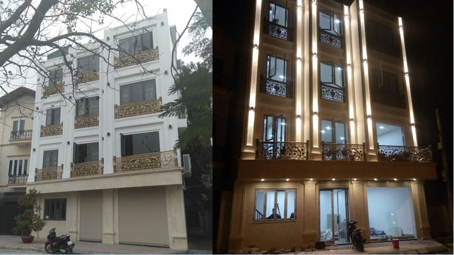 Ngôi nhà có mặt tiền khá rộng nhìn thẳng ra Hồ Tây, mặt tiền được sử dụng nhiều cửa nhôm kính mở quay nhầm tối ưu View và lấy gió từ Hồ Tây (Ảnh chụp ban ngày và ban đêm)