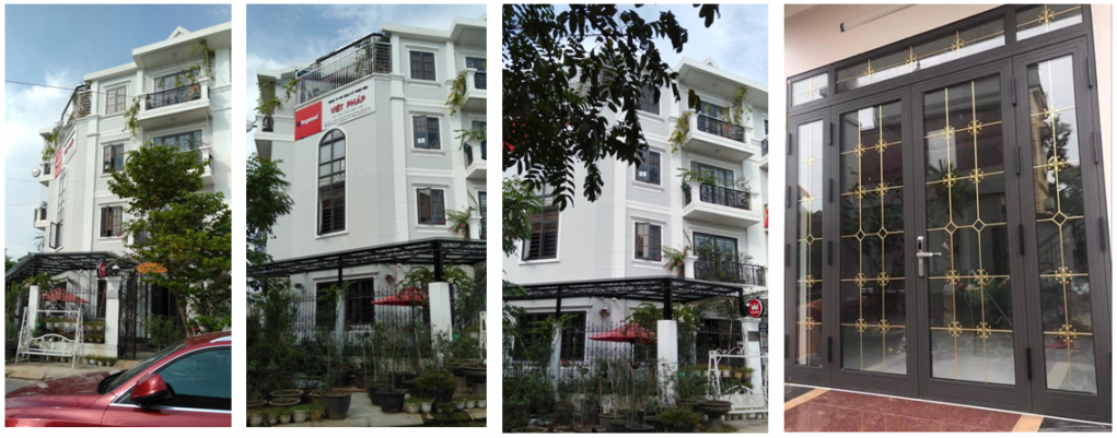 Công trình pha trộn phong cách hiện đại và một chút một chút phong cách cổ điển nên phần cửa nhôm kính được thiết kế vòm và nan trang trí phù hợp với phong cách của công trình